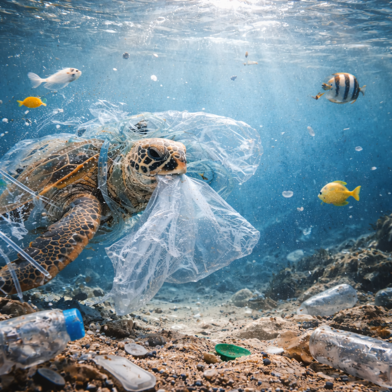 One of the most visible consequences of plastic pollution is its impact on oceans. At least 8 million metric tons of plastic enter the oceans every year, where it harms marine species through ingestion, entanglement, and ecosystem disruption.